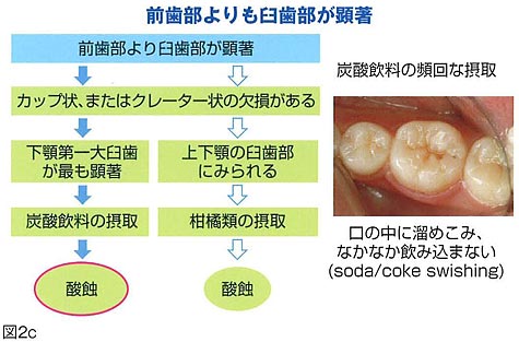 ![]() ![]() 第三の歯科疾患とは、何か? この数年、Tooth wear (トゥース・ウェアー)がう蝕、歯周病に次ぐ第三の歯科疾患と言われて、注目されるようになっています。Tooth wearとは、咬耗,摩耗あるいは酸蝕によって歯の表面の正常な構造が失われた状態を言います。このうち、「酸による歯質の欠損」ただし「細菌が関与しない酸」によるものが酸蝕症です。